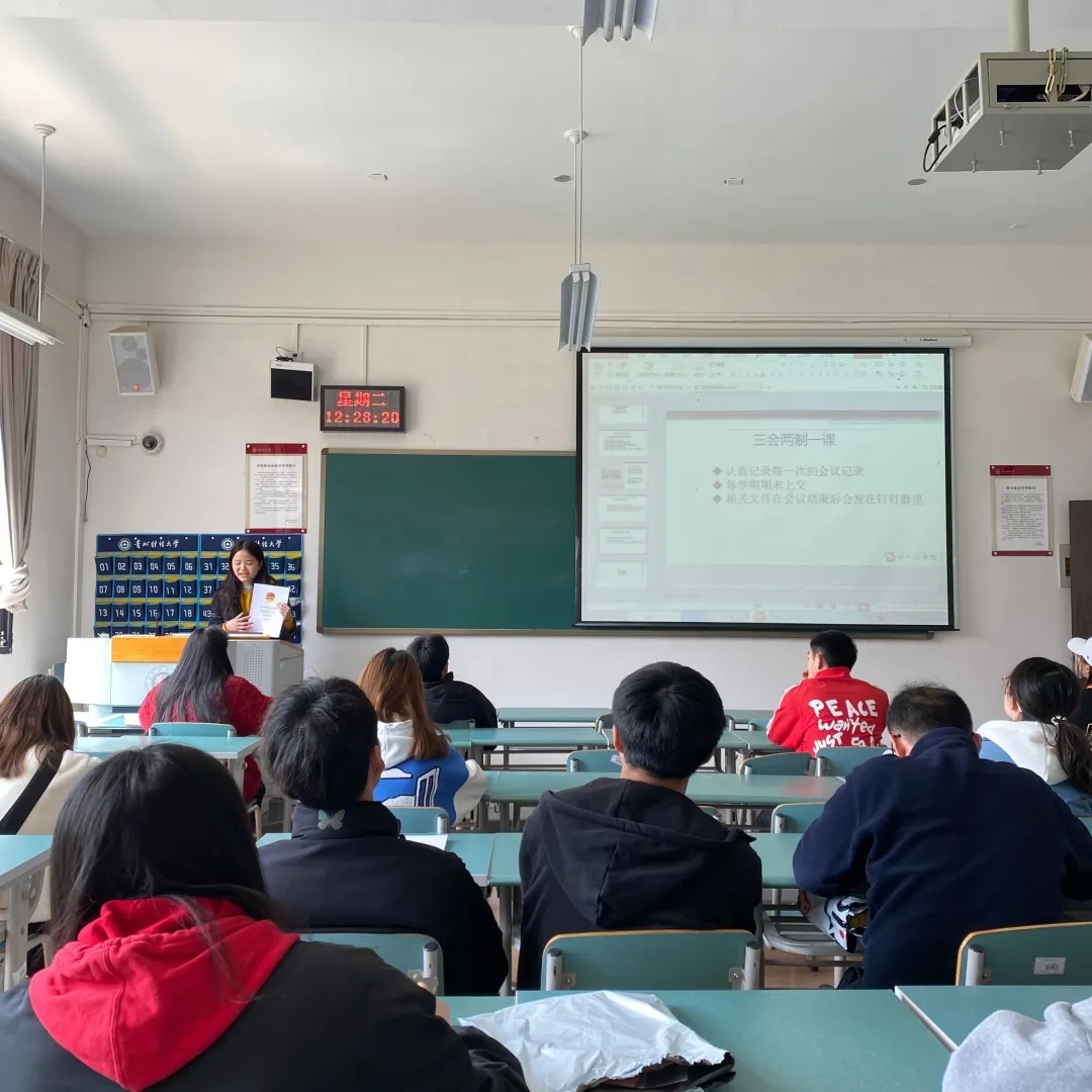 会议上,团委办公室部长王娟向各班团干分发团支部工作记录本,并对会议记录和简报、青年大学习、三会两制一课等工作方面提出具体要求,要求其在新的一年提高办事效率与自身能力。紧接着,团委组织部部长吴锐对过去一学期的工作进行总结,并对各班团干在各方面取得的成绩提出表扬。同时,对新学期的工作进行如下安排:提高对智慧团建流程的熟悉,对新入团成员加大考核,维持团课的有序开展。