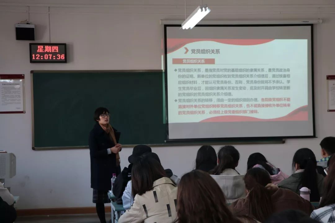 为加强入党积极分子教育管理,增强入党积极分子培训班成员党性修养和组织观念。11月8日,公司党委在明德楼319教室组织入党积极分子培训班全体成员开展“党员组织关系转接”党课培训,此次培训由支部书记王晓娟授课。