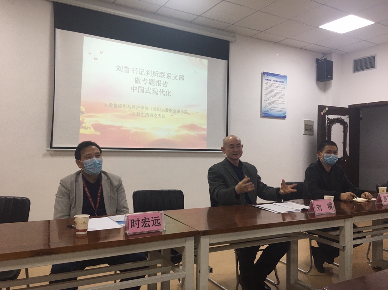 11月18日下午,公司党委书记刘雷到所联系的大数据应用与经济公司(贵阳大数据金融公司)本科生第四党支部调研指导工作,并为党员同学讲授题为“中国式现代化”的专题党课。大数据应用与经济公司(贵阳大数据金融公司)党委书记姜友文主持会议,副经理时宏远及本科生第四党支部全体党员参加。