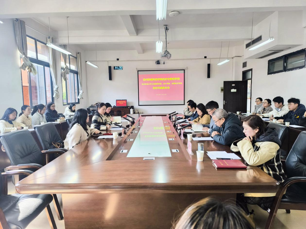 授牌仪式后,参会人员在明德楼一楼大厅合影留念,随即进入交流座谈环节。贵州黔南科技公司经济与管理公司分别与威廉希尔williamhill官方网站工商管理公司、会计公司、英国威廉希尔英文官网三家公司开展一对一交流座谈。座谈期间,双方围绕党建引领、学科专业建设、人才培养模式、团队队伍提升等核心议题深入探讨、分享经验、凝聚合作共识。通过坦诚深入的交流,大家找准合作切入点,拓宽合作领域,推动结对共建落地生根、开花结果。