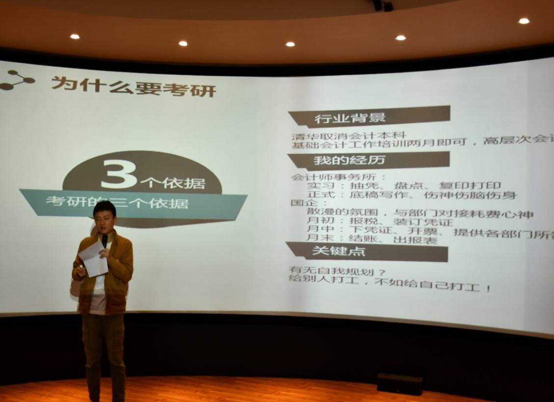 祝明洲同学从为什么要考研、什么是考研、如何考研、考研感悟以及书籍推荐五个方面分享自己的考研经验,认为考研是给大家提供了一个层级跃升、梦想成真的机会,针对公司会计专硕研究生入学考试进行了详细的介绍,指出做好计划、积累、复习和反馈在备考中的重要性,并谈到了自己的考研感悟以及相关考研书籍的推荐,最后祝明洲同学希望同学们都能够寻找到自身的价值,也欢迎同学们咨询考研相关问题。