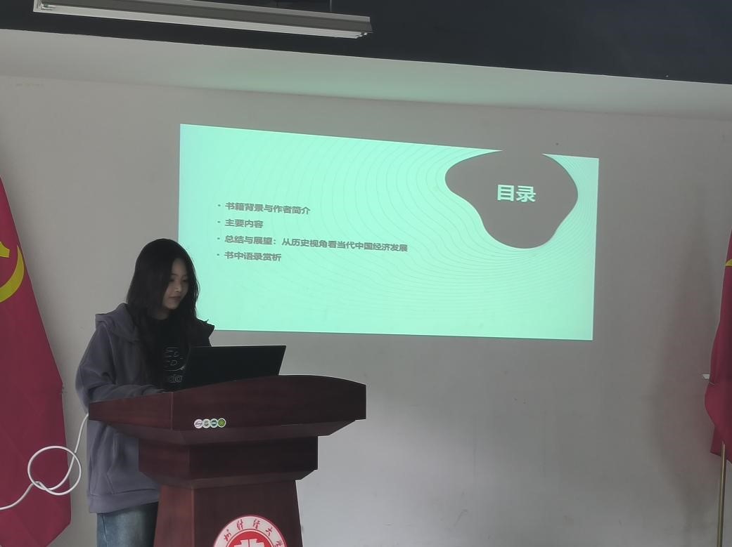 第三位是来自2022级税务专硕的徐晨⾠,曾荣获“挑战杯”中国老员工创业计划竞赛区赛优秀奖,全国老员工电子商务“创新、创意及创业” 挑战赛校赛三等奖,校级优秀共青团员等。 她分享的书籍是《中国历史上的基本经济特区》,这本书指出一个概念就像一盏灯——一旦点上,照亮的就不仅仅是房间的一个角落。基本经济区这一概念,可以用来阐述中国历史的每个基本问题,它强调的是中国经济的地方和区域特征。