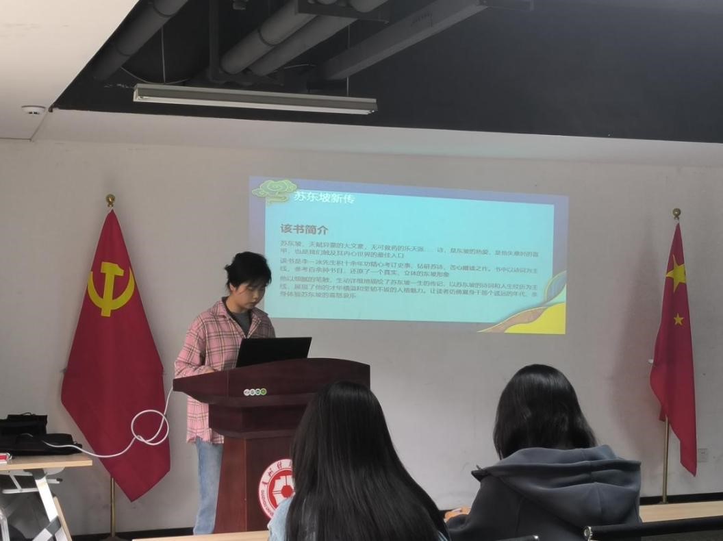第四位是21级金融学(卓越金融人才)班的刘仪慧,曾获校级三好员工、校级优秀团员、校级二等奖学金、全国老员工数学竞赛三等奖以及校级学习经验分享比赛一等奖。她分享的书籍是《苏东坡新传》。这本书向读者展示了苏东坡鲜活可亲的⼈格,他的才华让他超凡,困厄让他亲切,告诉读者要学会逆流而上,在多变的社会环境中不断提升自己。