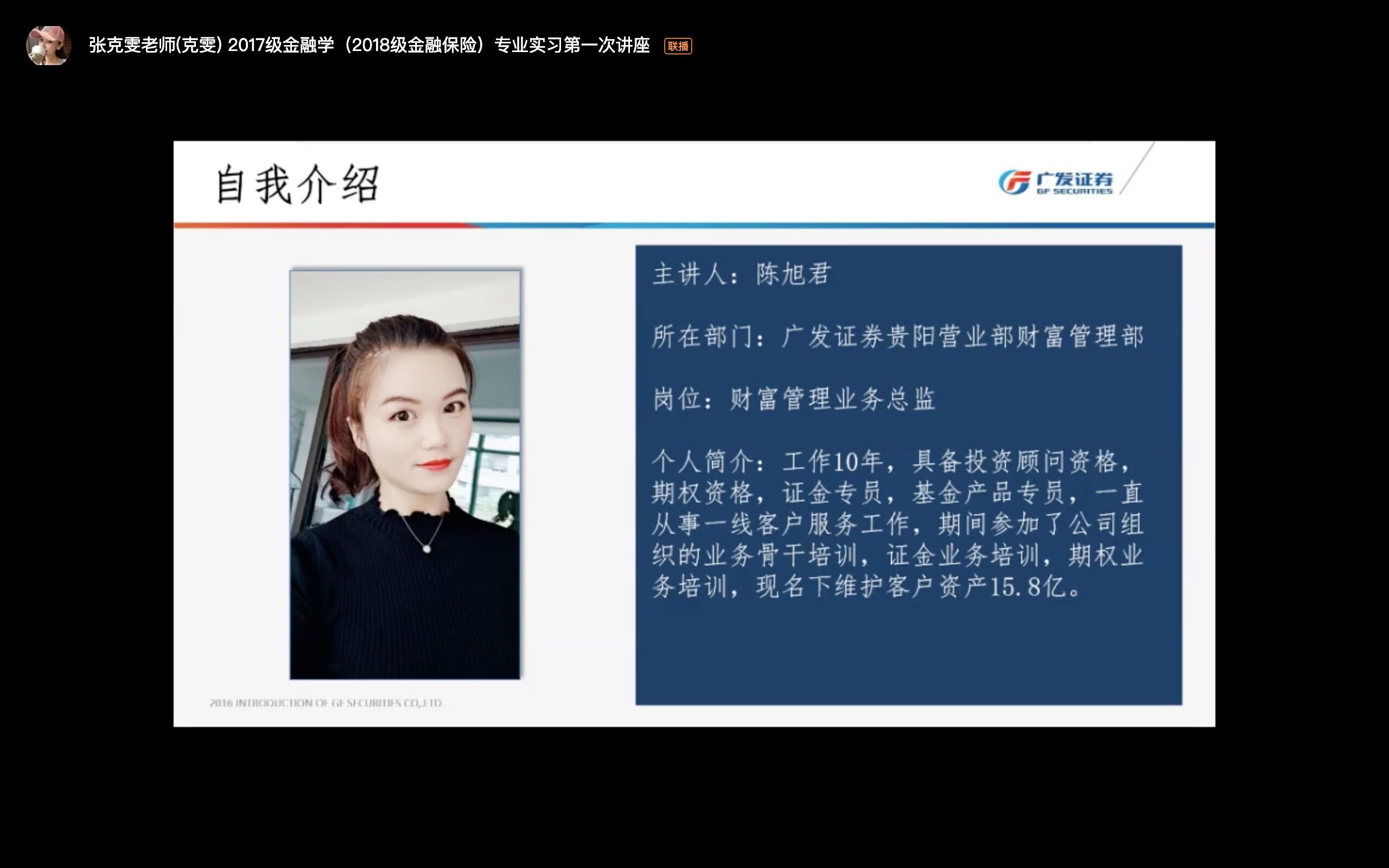 张克雯老师致开场辞,随后陈旭君老师就“财富管理之资产管理背景介绍”、“财富管理业务转型”、“财富管理合规与风控”三个方面开展本次讲座。同学们认真聆听,积极互动,提出了疑问与困惑。陈老师语言风趣幽默,传授工作经验深入浅出,详细解答同学们关于就业门槛、晋升通道、薪资待遇等问题。