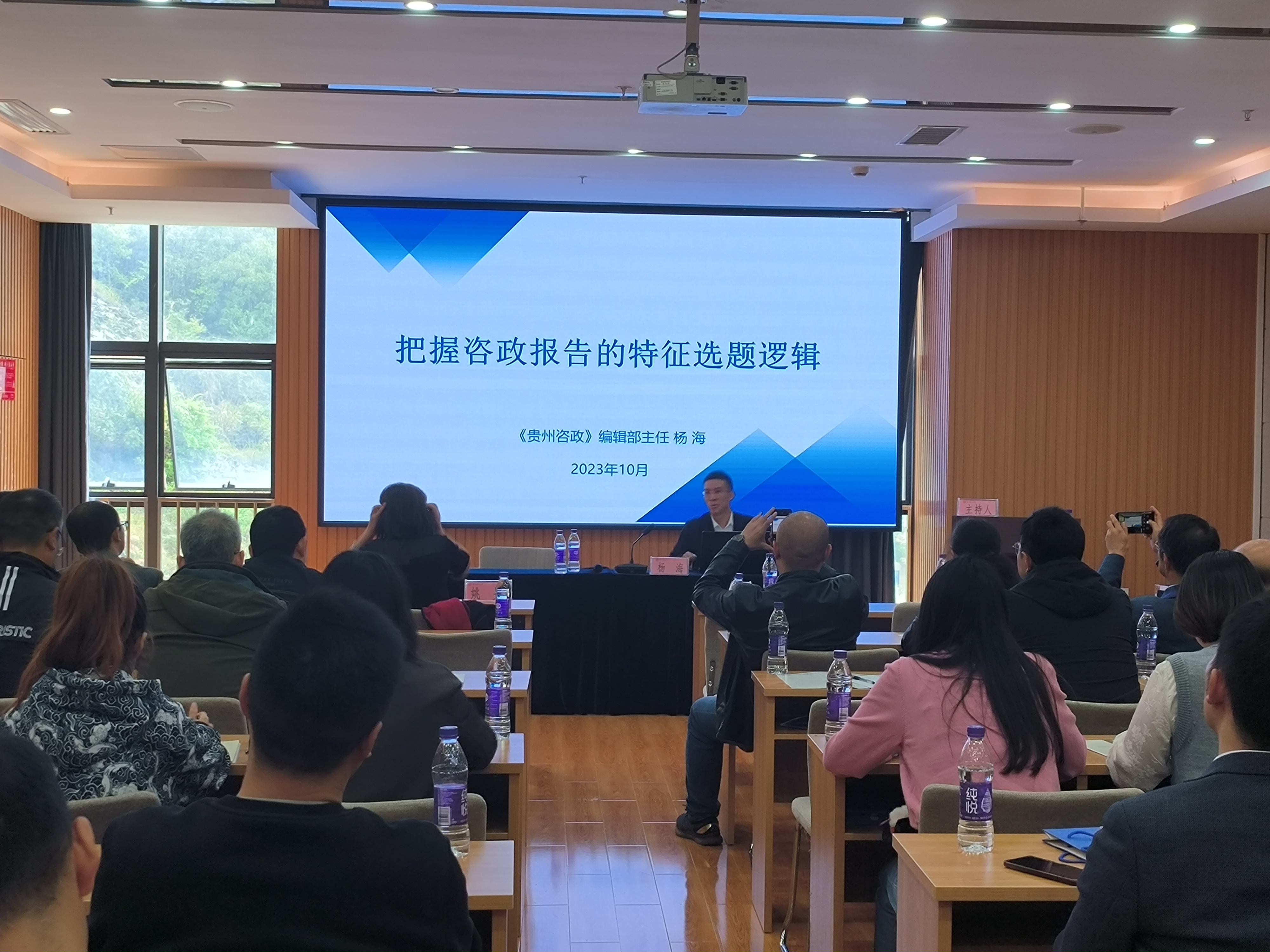 贵州省社科联《贵州咨政》编辑部主任杨海做了交流发言,围绕咨政报告研究选题的提出的逻辑,详实地介绍了资政报告撰写的技巧,并介绍了近期咨政报告的重点研究选题,为各基地主任围绕“四新”主攻“四化”,立足贵州实际,积极献言建策,提供了重要的借鉴。