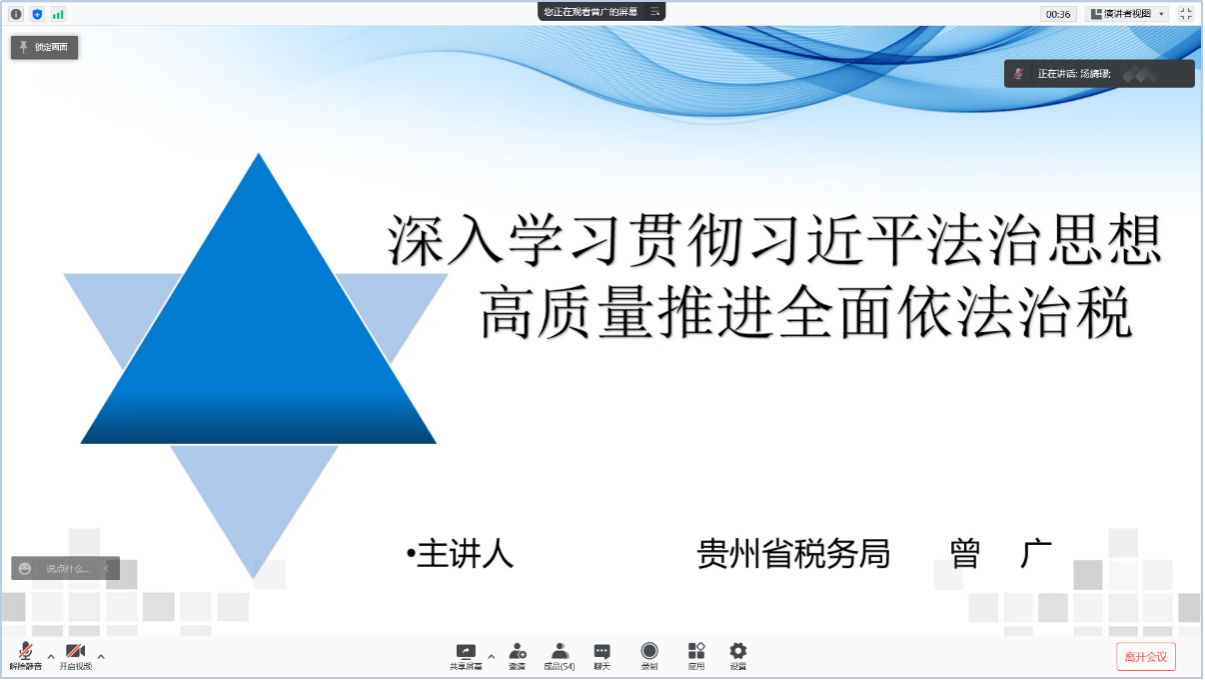 大数据应用与经济公司(贵阳大数据金融公司)邀请贵州省税务局政策法规处处长、贵州省行政法学研究会常务理事、税务硕士(MT)校外合作导师曾广老师于2021年12月3日14:30-17:00为该专业2020级、2021级全体硕士研究生进行《深入学习贯彻习近平法治思想 高质量推进全面依法治税》专题讲座,本次讲座由大数据应用与经济公司(贵阳大数据金融公司)汤旖璆老师主持,通过腾讯会议方式举行。