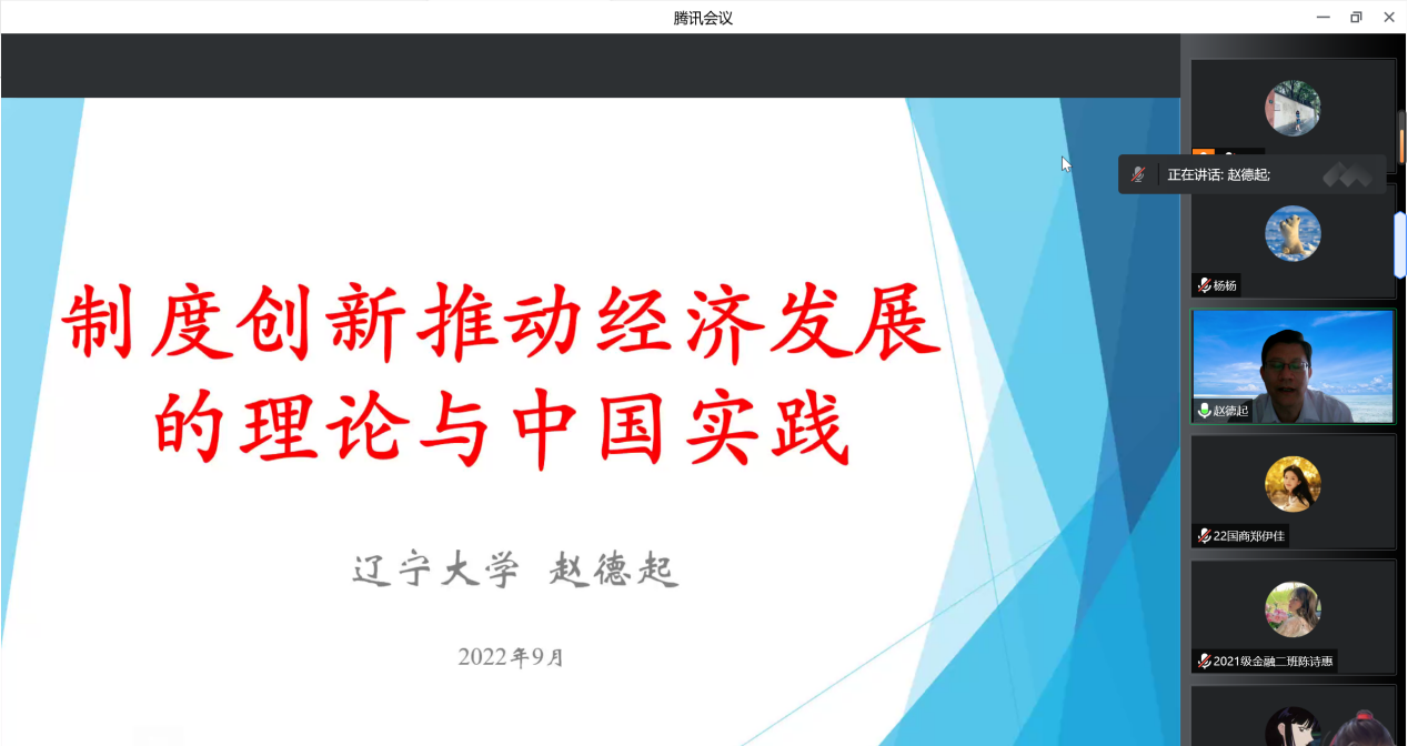 在讲座中,赵德起教授从中国经济发展基本事实、社会基本矛盾变化以及新时代经济发展动力的转变等谈起,讲述了对制度、治理与经济的再解释,总结了制度推动经济发展的内核与外部要素,梳理了制度推进经济发展的中国实践,探讨了中国特色制度创新的思想、路径与关键。