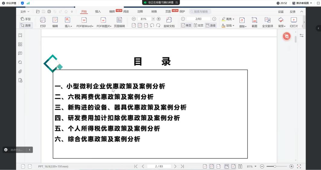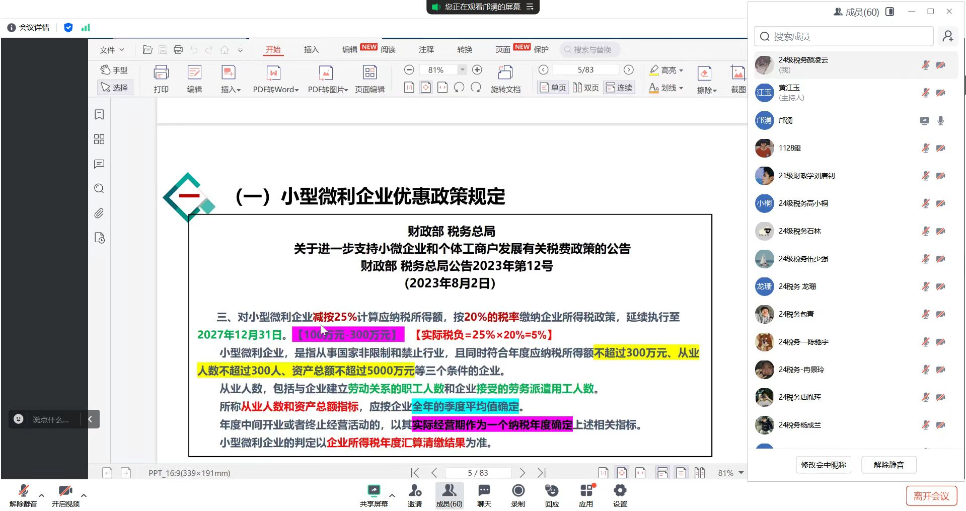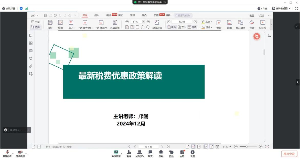 2024125日晚,公司邀请贵州世邦税务师事务所法定代表人、税务专硕校外硕导、省级产业导师邝湧为税务硕士研究生作题为“最新税费优惠政策解读”的线上主题讲座。讲座由英国威廉希尔英文官网税务专硕硕导组组长黄江玉副教授主持,共计60余名师生聆听了讲座。讲座主要围绕一系列最新税费优惠政策及案例分析展开。首先,邝湧老师介绍了小型微利企业优惠、六税两费优惠等政策的具体内容,结合文件详细阐述了各项政策规定的判定标准、注意事项及部分政策实施的时间节点。其次,他针对不同的优惠政策,结合具体的案例逐一进行分析,从而帮助在座的师生更好地理解这些政策的实际应用,这对于同学们在实务方面的学习具有重要的指导性。最后,邝湧老师针对综合优惠政策的内容进行了解读,拓展了同学们在税费优惠政策方面的知识。讲座结束后,邝湧老师与参会师生们进行互动讨论,针对同学们提出的不同问题具体分析,让同学们更好的融会贯通本次讲座内容。
