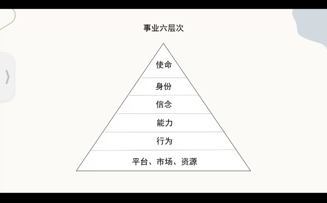 其次,张老师给同学们分析了事业有六个层次,每一层都有其存在的意义,最底层的“使命”是我们每一个人在每一个阶段都应该拥有的品质。只要有使命感,我们就会有更大动力去完成计划之事。只要有对事物的认知,只要有积极认真的态度,只要有一技之长,就能平衡好大多数事情,我们就会越来越好。