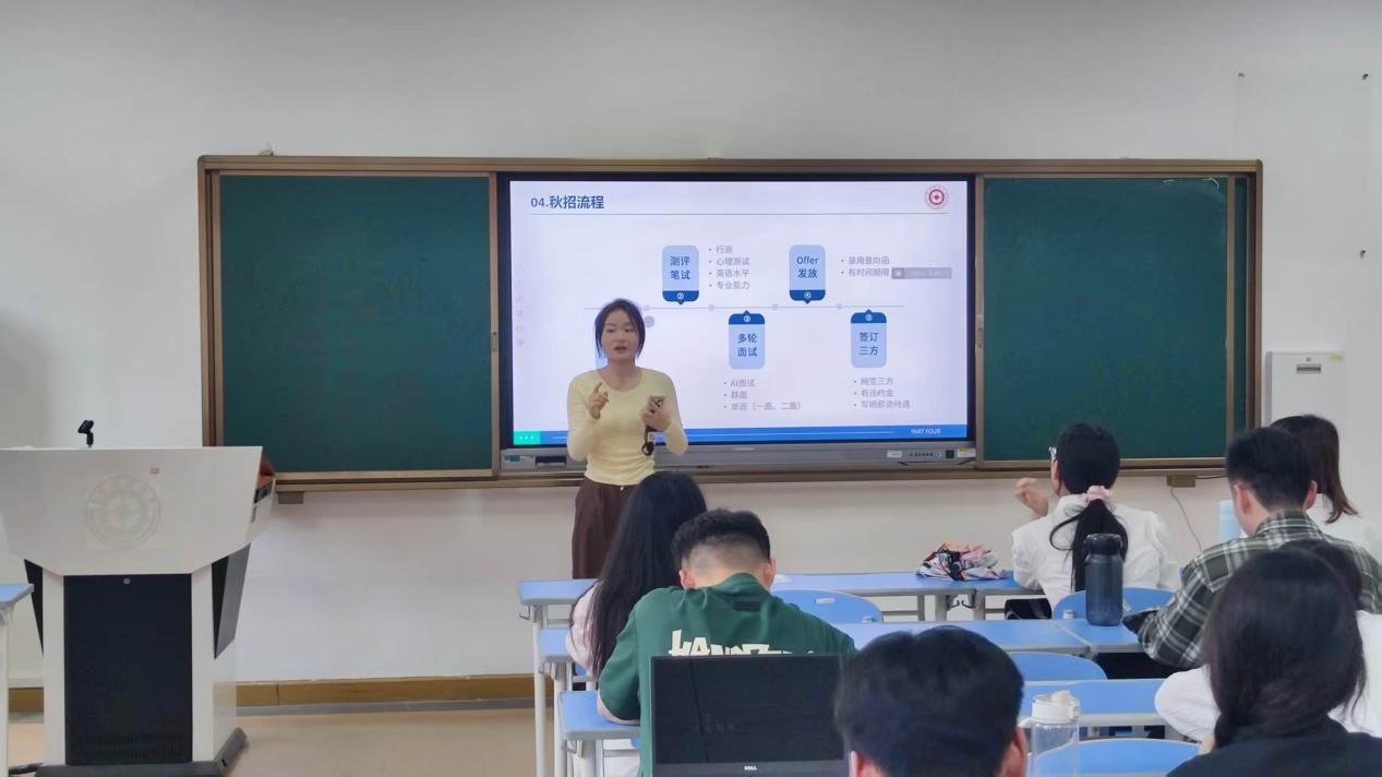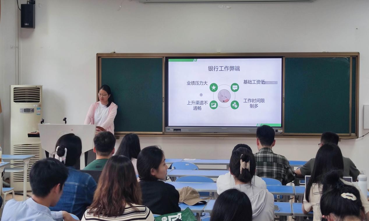 在就业经验分享环节,首先王涵宇同学为大家分析银行工作利弊,分享秋招关键点,探讨银行与考公备考关系,强调明确自身需求的重要性。陈沛佳同学则详细介绍了秋招时间线、工具包、流程及心态等内容。她强调简历要突出亮点,面试要自信表达,秋招是双向选择,要打破信息差,与伙伴同行,争取Offer。两位学姐的分享干 货满满,为学弟学妹们带来了实用指导。