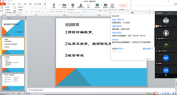 6月24日,2017级金融学1班生活委员李文浦通过线上组织了关于诚信教育的班会。此次班会内容以预防诈骗教育、远离不良贷、提高征信意识、金融意识、法律意识、诚信考试等几个方面为重点进行讲解。