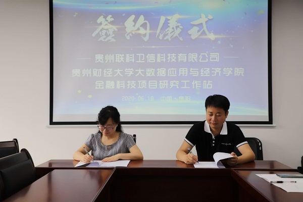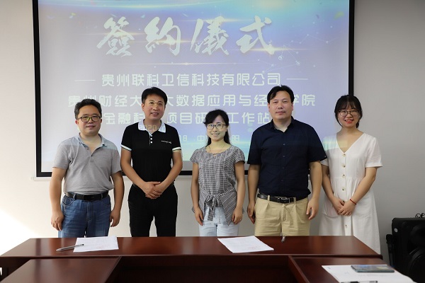 6月18日上午,大数据应用与经济公司与贵州联科卫信科技有限公司金融科技项目研究工作站签约仪式举行。贵州联科卫信科技有限公司冯刚总经理,大数据应用与经济公司杨杨经理、时宏远副经理、施若教授参加了签约仪式。