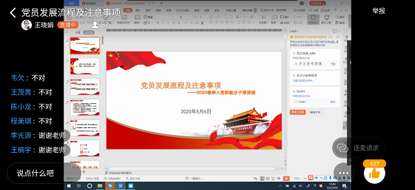 为了让积极分子们了解正式党员的发展流程,公司王晓娟老师在5月6日12:30以网上授课的形式给大家上课,详细地讲解了每个过程需要注意的事项。