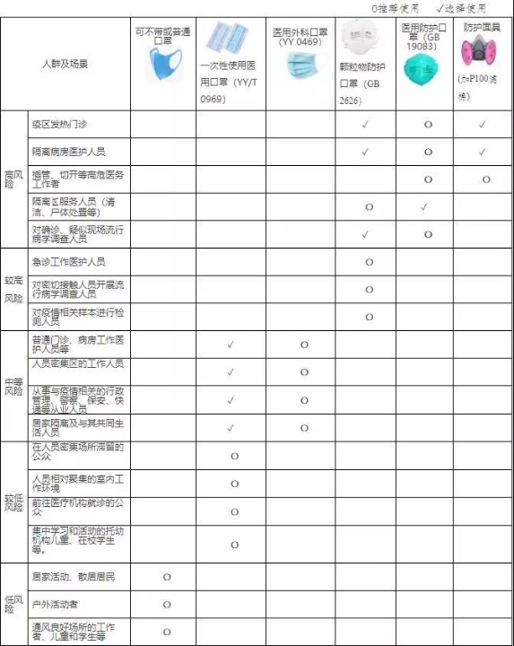 在新型冠状病毒感染的肺炎流行期间,建议选择合适的口罩类型,不过度防护。按防疫工作性质和风险等级提出以下指引: