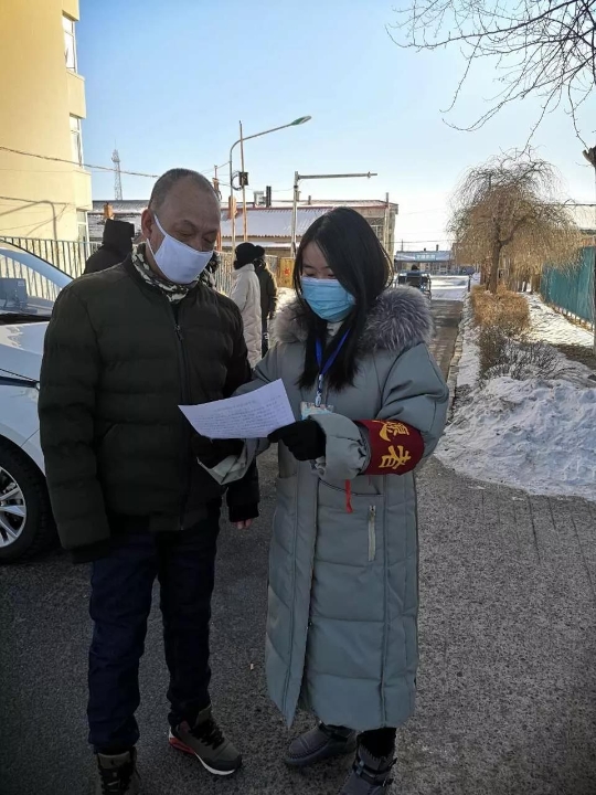 朱雪卉,中共党员,2017级数量经济学研究生,在黑龙江省伊春市南岔县浩良河镇浩化社区,参与辖区信息排查,并逐门逐户分发居民出入通行证,为群众细心讲解出行细则。