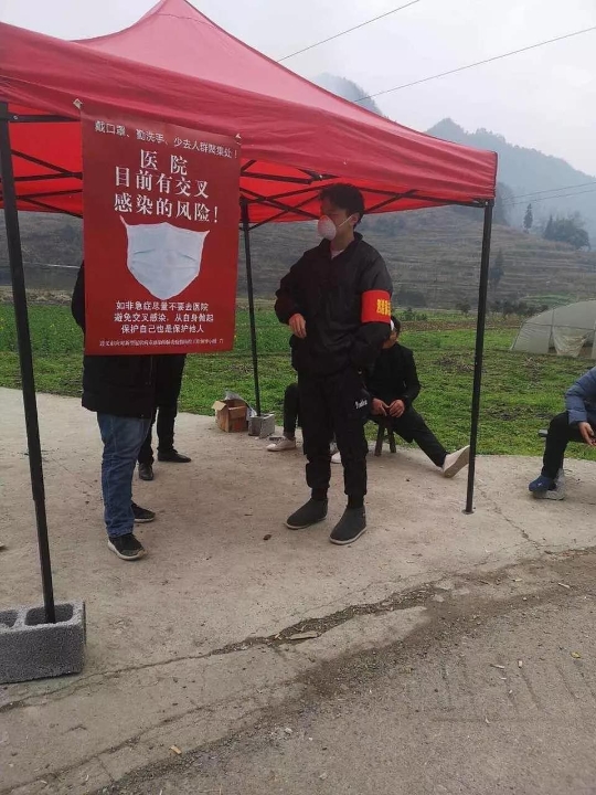 刘欢,共青团员, 2018级投资学类一班员工,在贵州省毕节市七星关区八寨镇华山村疫情卡点处登记出入人员信息和去村里宣传疫情防控知识。