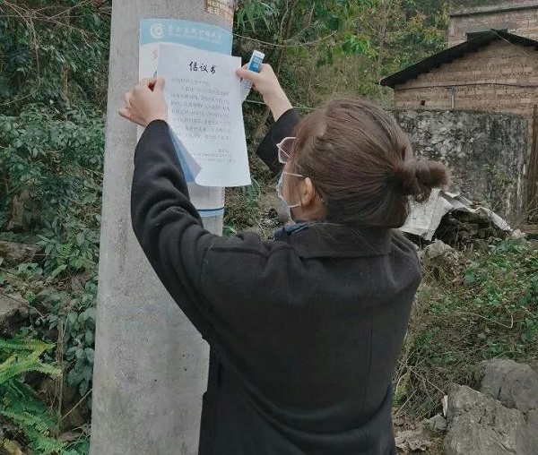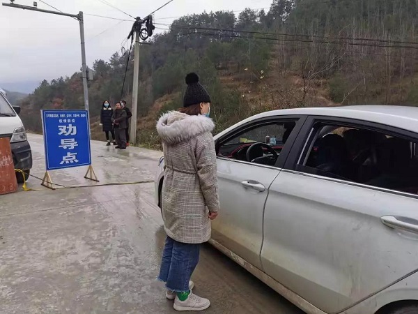 张燕,2019级财政学类三班员工,在贵州省铜仁市思南县大河坝镇盐丰村,协助村干部做疫情防控工作,对过往的车辆进行劝返,并核实身份做好登记。