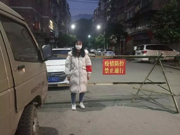 袁珊,2018级金融学类1班员工,在贵州省赤水市官渡镇新区参加疫情防控,主要是控制社区人口流动,不允许任何外来人口随意进出社区,做好信息登记。