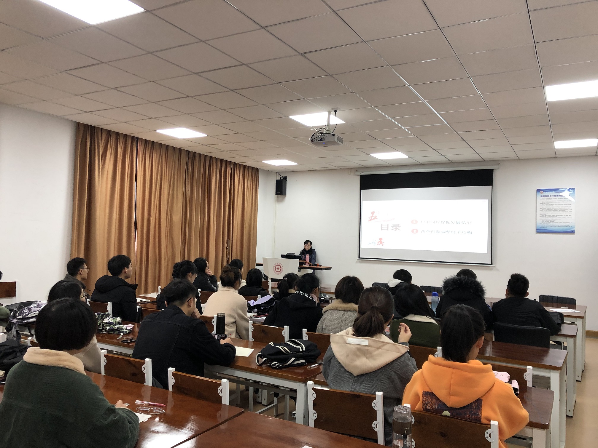 杨经理立足专业特色,结合当今中国发展现状,从经济发展提质增效引领新常态、民主政治凝聚起同心筑梦的磅礴力量,文化建设凝心聚力增强自信、改善民生让人民有更多的获得感、绿水青山就是金山银山的生态文明建设等五个方面与同学们分享在中国共产党的正确领导下,中国在政治、经济、文化、生态等方面取得的伟大成绩。她勉励同学们,新时代需要新担当新作为,作为社会主义事业的建设者和接班人,大家要珍惜校园时光,刻苦学习,强硬本领,以高度得责任感和主人翁意识,自觉将个人奋斗与祖国发展需要结合起来,在实现中华民族伟大复兴的中国梦中实现个人理想,燃烧青春。