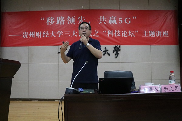 10月9日下午,应校团委和大数据应用与经济公司邀请,贵州移动大数据分公司总经理、高级工程师李文华先生做客公司“科技论坛”,作题为《移路领先,共赢5G》的专题讲座。讲座由董事长助理候超惠主持,公司近170余名师生聆听讲座。