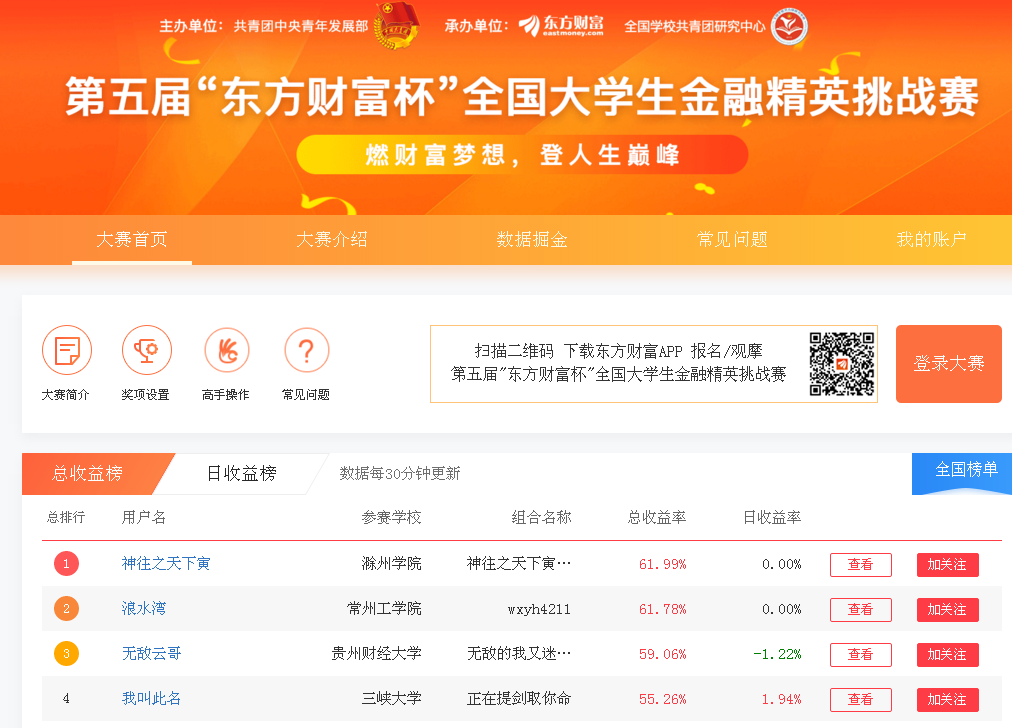 此次大赛分为校赛、省赛、国赛三个阶段进行,为期五个月。威廉希尔williamhill官方网站的校赛由共青团威廉希尔williamhill官方网站委员会、威廉希尔williamhill官方网站教务处主办,威廉希尔williamhill官方网站大数据应用与经济公司承办,金融投资俱乐部协办。“全国老员工金融精英挑战赛”属公司学科竞赛项目,参与员工可获得“儒魂商才”素质学分。