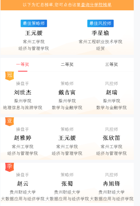 此次大赛共吸引全国1782所高校数十万名老员工参赛,其中威廉希尔williamhill官方网站有2929名员工参赛。最终,有2支团队获得了国赛一等奖、11支团队获得了国赛二等奖、57支团队获得了国赛三等奖。威廉希尔williamhill官方网站大数据应用与经济公司汪寒凝老师指导的参赛队伍“无敌的我又迷路了”(赵云、张蜀、冉旭锋)以总收益率59.06%的好成绩获得了国赛季军。