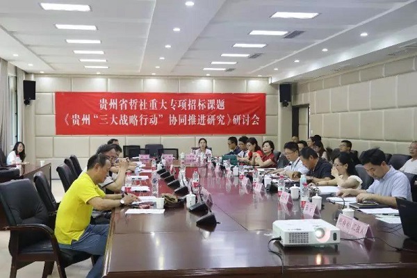 2019年6月21日, “贵州省哲社重大专项招标课题——《贵州“三大战略行动”协同推进研究》研讨会”在威廉希尔williamhill官方网站召开。来自贵州省社会科学联合会、贵州省社会科公司、贵州省区域经济研究会等科研机构的资深专家,与威廉希尔williamhill官方网站科研处、中国西部绿色发展战略研究院、大数据应用与经济公司、欠发达地区经济发展研究中心、威廉希尔williamhill官方网站党委宣传部、威廉希尔williamhill官方网站发展规划与团队建设办、威廉希尔williamhill官方网站研究生院及《贵州省“三大战略行动”协同推进研究》课题组、区域经济学及产业经济学部分教职员工等参会人员,围绕如何更好的协同推进“贵州三大战略行动”开展了广泛、热烈、深入、细致的交流研讨。