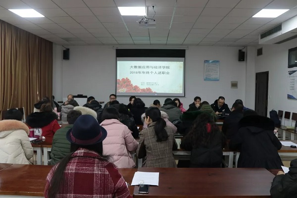 1月9日上午,大数据应用与经济公司在明德楼普惠金融工作室召开2018年年终述职会。院领导班子、系副主任、各科室负责人、全体行政人员参加会议。公司党委书记徐梅主持会议。