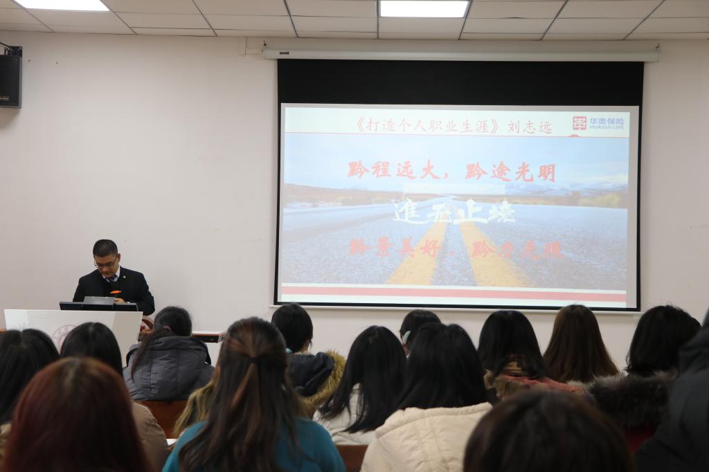 捐赠仪式完毕,刘志远副总经理对同学们进行了就业指导培训,他以“打造个人职业生涯”为主题,介绍自己的打拼历史,升职历程,加深同学们对工作岗位的理解。