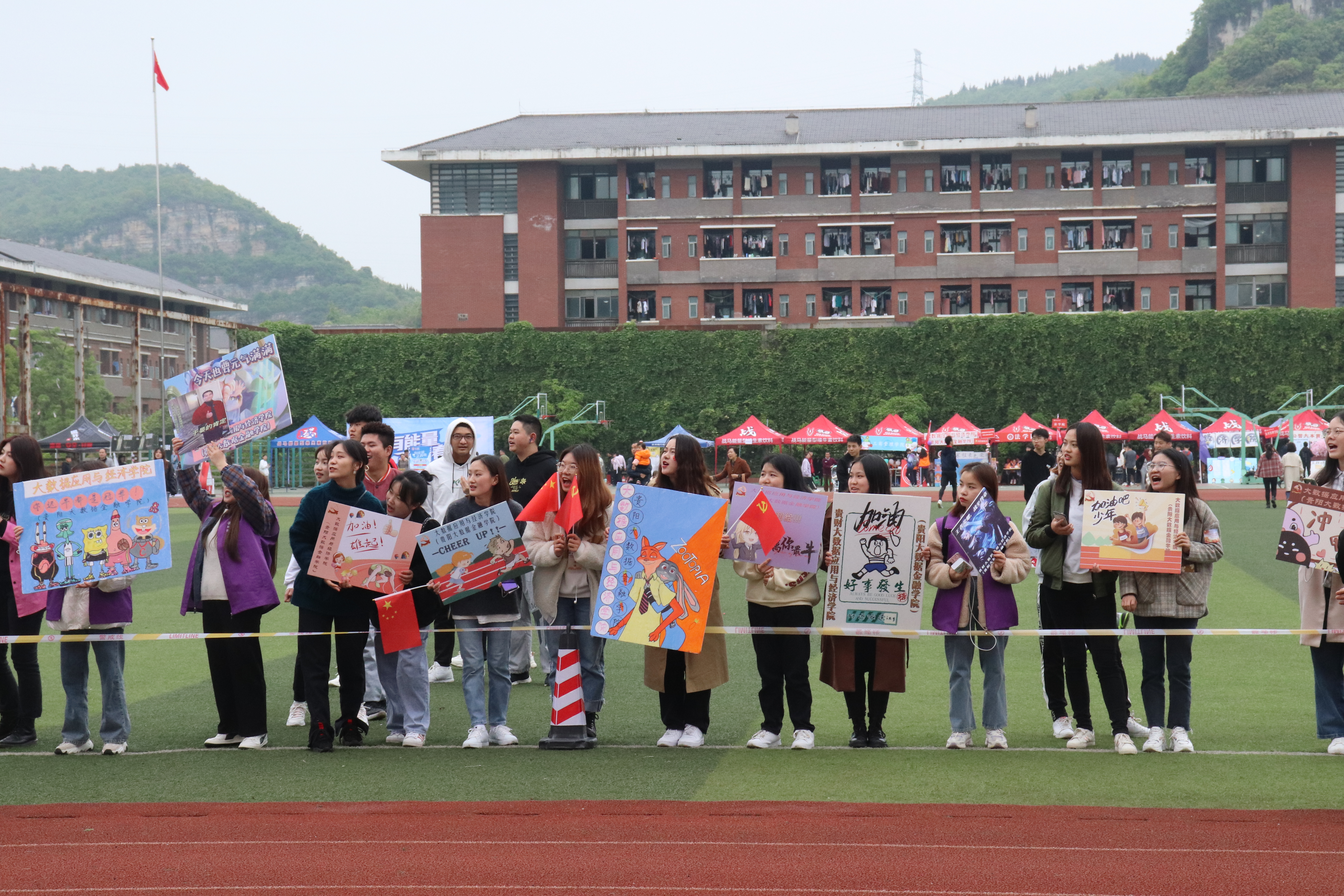 师生齐上阵,赛场战风云,他们热情饱满、勇敢无惧;他们活力无限、永不言弃。随着比赛的进行,观众席上党员服务队的志愿者们更是深受感染、热情高涨。他们散落在运动场的每一个角落,有的陪运动员检录,有的在胜利的终点等待着运动员的到来,有的撰写加油稿激励运动员勇往直前。他们更用一句句加油呐喊、一阵阵擂鼓助威、一遍遍鼓掌摇旗、一棒接一棒的陪跑,全心全意地投身于运动会的组织建设中,使运动员们深受感染,斗志昂扬!