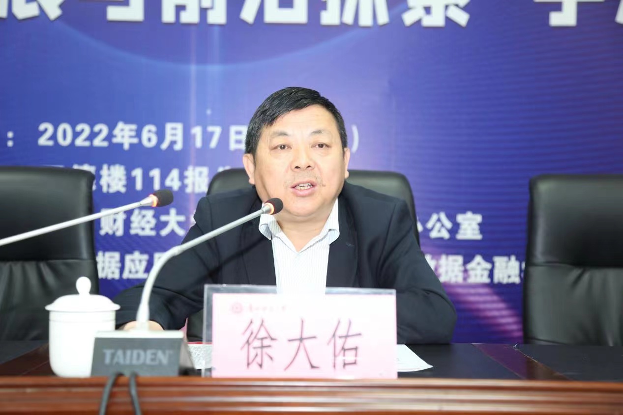 徐大佑教授致辞,首先他指出大数据应用与经济公司(贵阳大数据金融公司)承办的本期“对话与争鸣”学术论坛与上周多个大型学术会议一脉相承,紧密相关。并表示大数据应用与经济公司(贵阳大数据金融公司)将第三期“对话与争鸣”学术论坛的主题确定为“数字经济发展与前沿探索”体现了扎根贵州大地做好“大地论文”的政治意识和学术情怀。接着他指出了贵财的学术活动呈现井喷式发展,老师和同学们也从“带着耳朵听”,转变为“带着文章讲”的形式。最后他对表达了对大数据应用与经济公司(贵阳大数据金融公司)的周密组织与安排工作表示了充分肯定,对即将举办的第四期“对话与争鸣”学术论坛表达了殷切期望。
