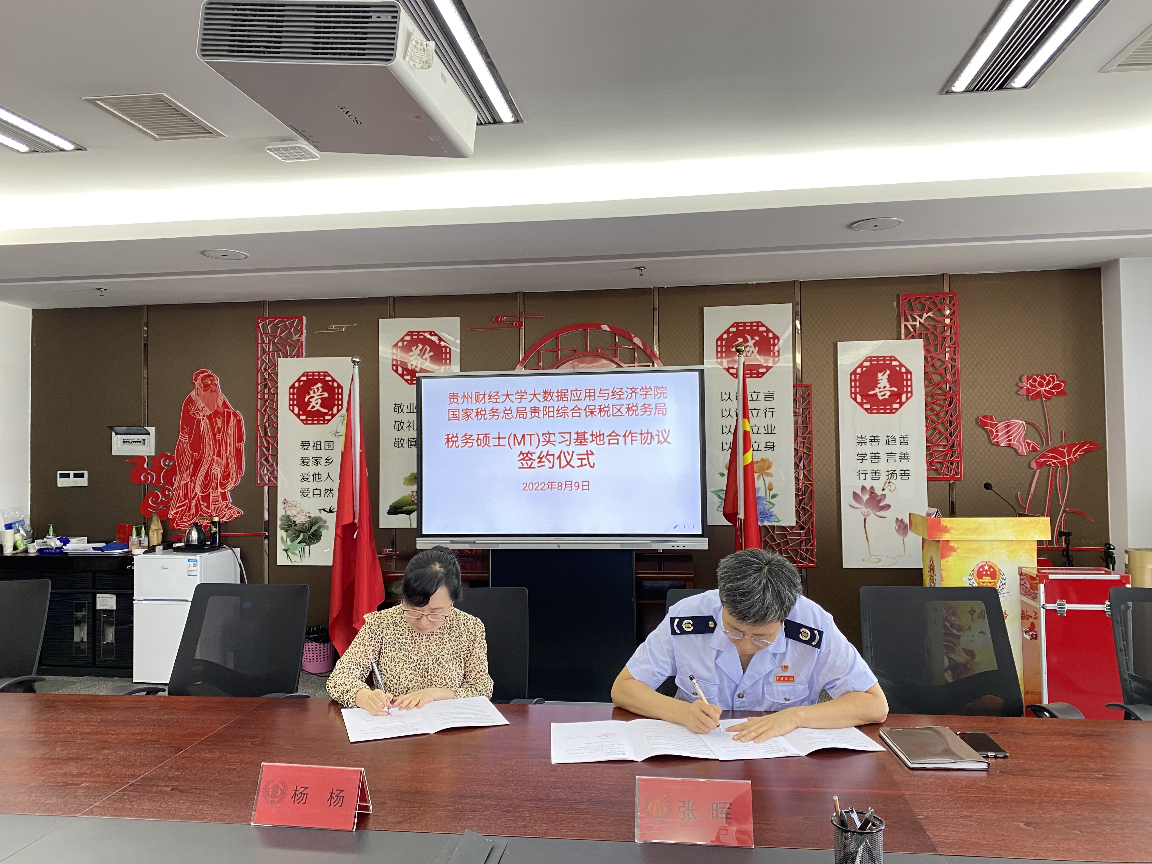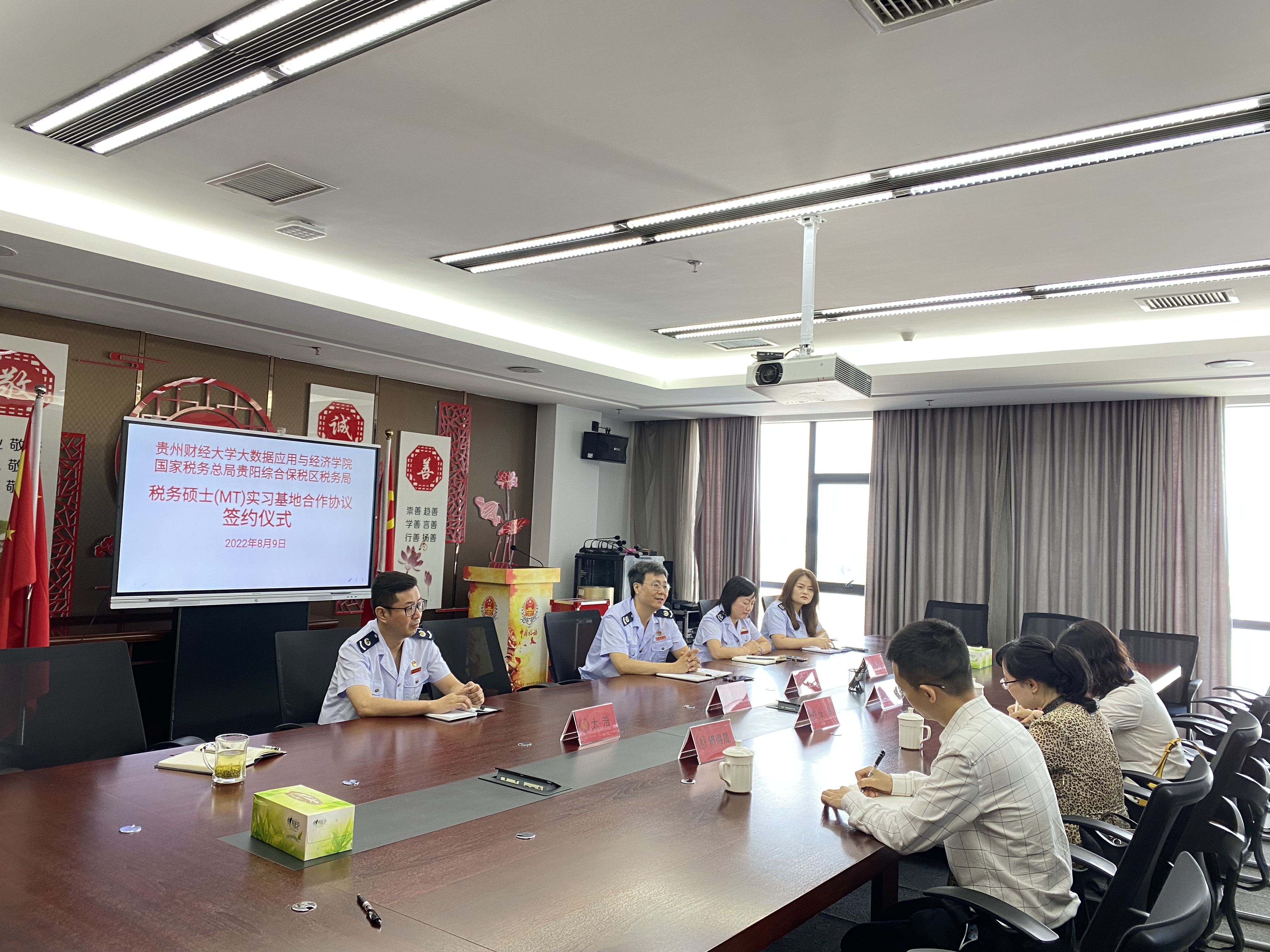 为进一步加强员工校外实习教学工作、促进产学研相结合、全面提高研究生教育质量,公司与国家税务总局贵阳综合保税区税务局本着相互协作、互惠互利、资源共享、共同发展的原则,于2022年8月9日,在贵阳综合保税区税务局会议室签订“大数据应用与经济公司(贵阳大数据金融公司)税务专业硕士(MT)实习基地协议书”,并举行授牌仪式。大数据应用与经济公司(贵阳大数据金融公司)经理杨杨、税务专业硕士(MT)硕导组副组长傅得晟、学科办工作人员参加了签约暨授牌仪式。会议由贵阳综合保税区税务局副局长张晖主持。
