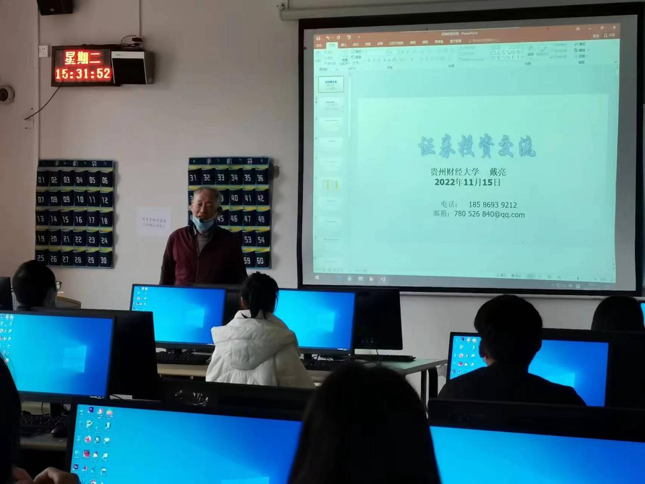 2022年11月15日,投资教工党支部开展“我为群众办实事”主题党日活动,戴亮教授与校金融投资俱乐部同学进行证券投资交流,向同学们介绍证券投资前沿理论与方法和实务交易经验,同学们收获满满。戴亮教授从事证券投资教学和研究已二十余年,是我省证券投资领域知名专家。金融投资俱乐部是向全校同学普及金融知识,营造科学投资氛围,提高金融投资应用能力的员工社团。组织多届由共青团中央青年发展部主办的全国老员工金融精英挑战赛贵州赛区比赛,公司参赛人数逾2000人,员工团队多次获得全国、全省一、二、三等奖。