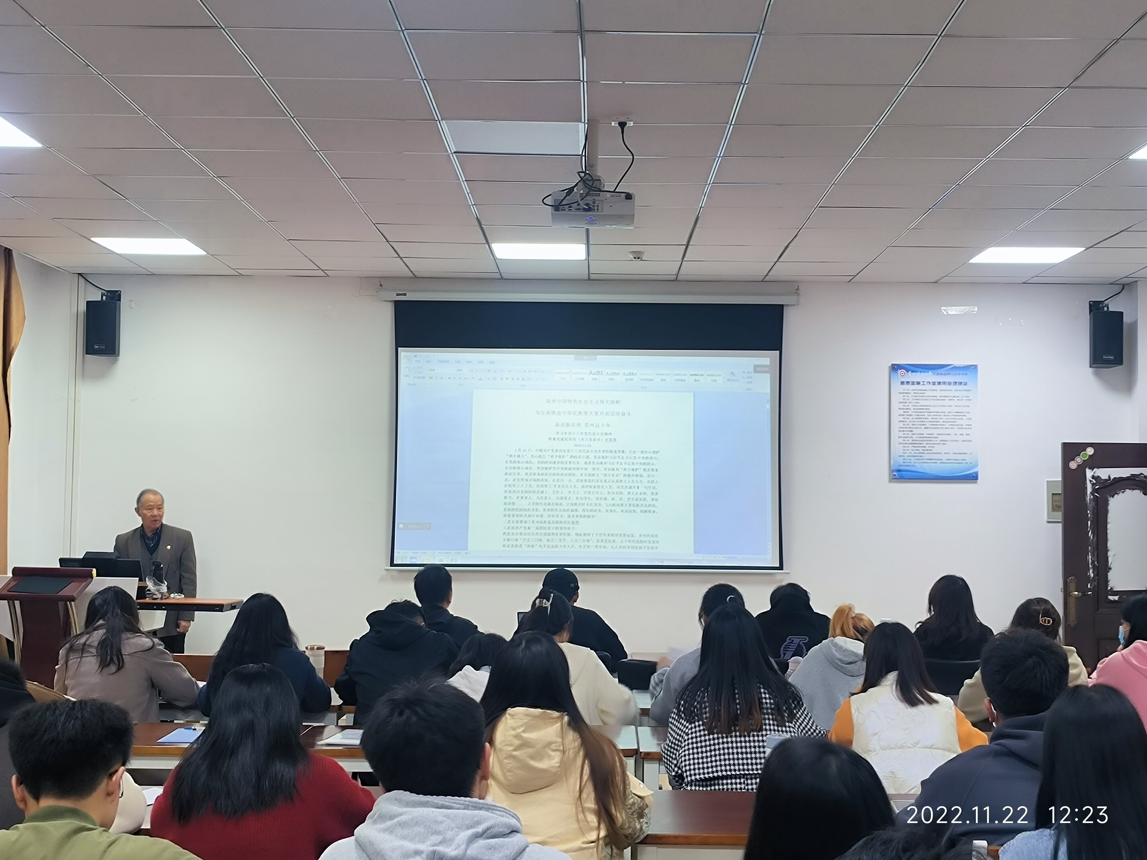 11月22日,校关工委史恩贤老师于明德楼普惠金融工作室以《奋进新征程,贵州这十年》为题为公司师生党员讲授党课。