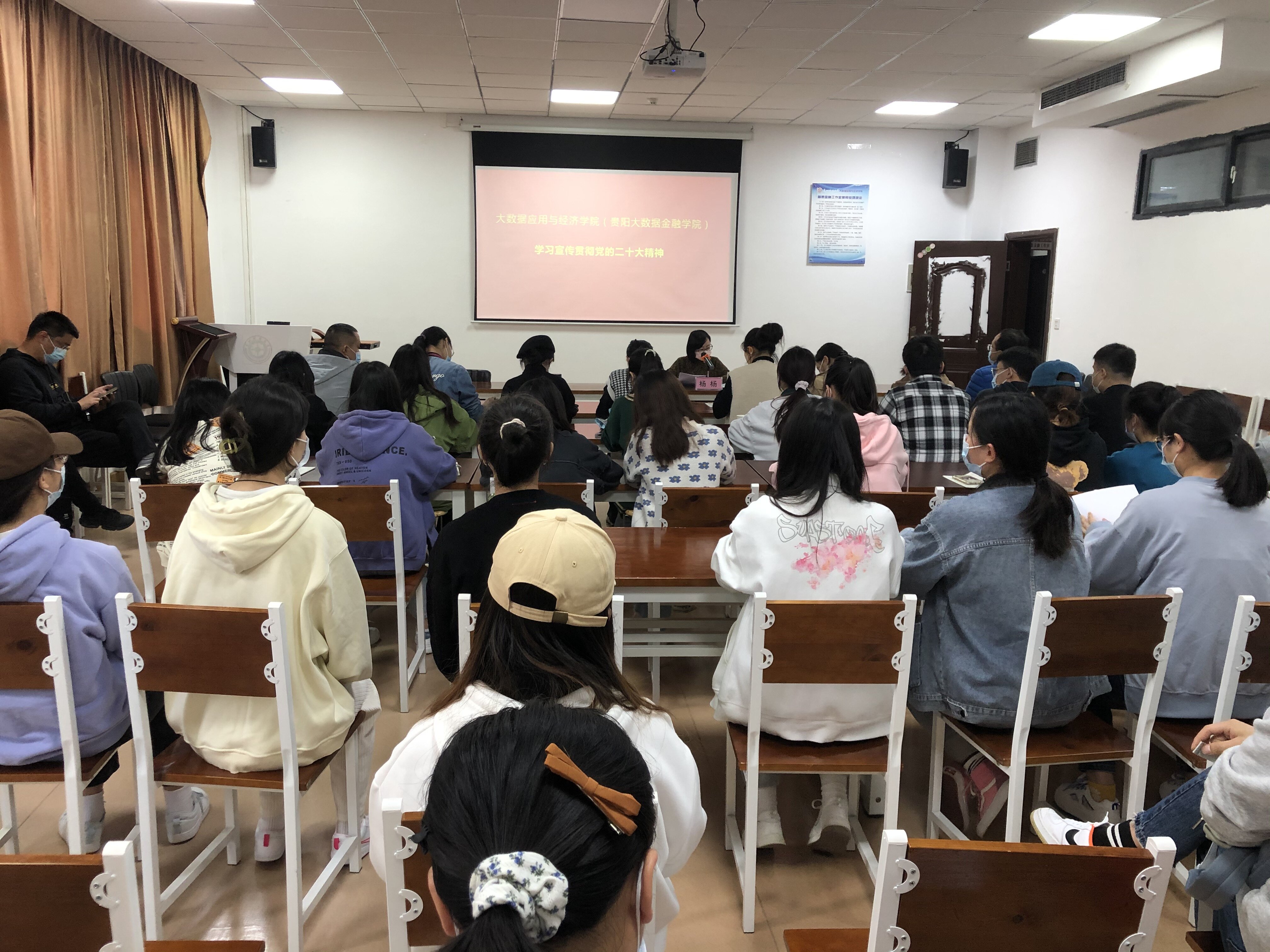 为了深入学习贯彻党的二十大精神,大数据应用与经济公司(贵阳大数据金融公司)于11月8日下午3点在明德楼普惠教室召开学习宣传贯彻党的二十大精神培训,杨杨经理主讲,全院师生党员通过线上线下方式参加培训。