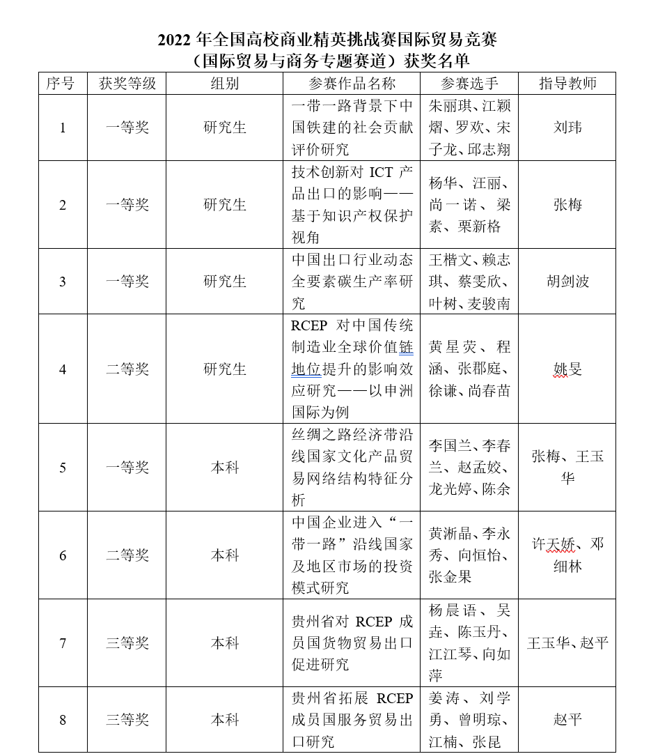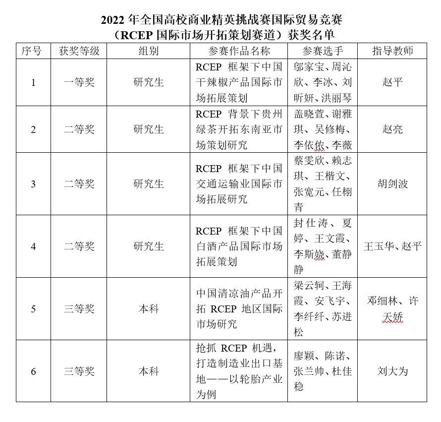 12月5日,全国高校商业精英挑战赛组委会公布了2022年全国高校商业精英挑战赛国际贸易竞赛(RCEP国际市场开拓策划赛道、国际贸易与商务专题赛道及涉外商事法律服务赛道)获奖名单。全国高校商业精英挑战赛是由中国国际贸易促进委员会商业行业委员会(简称“中国贸促会商业行业委员会”)牵头主办的国家级学科竞赛活动,已成为我国国际经贸教育领域基于校企合作规模最大的综合实践平台和学科竞赛活动。