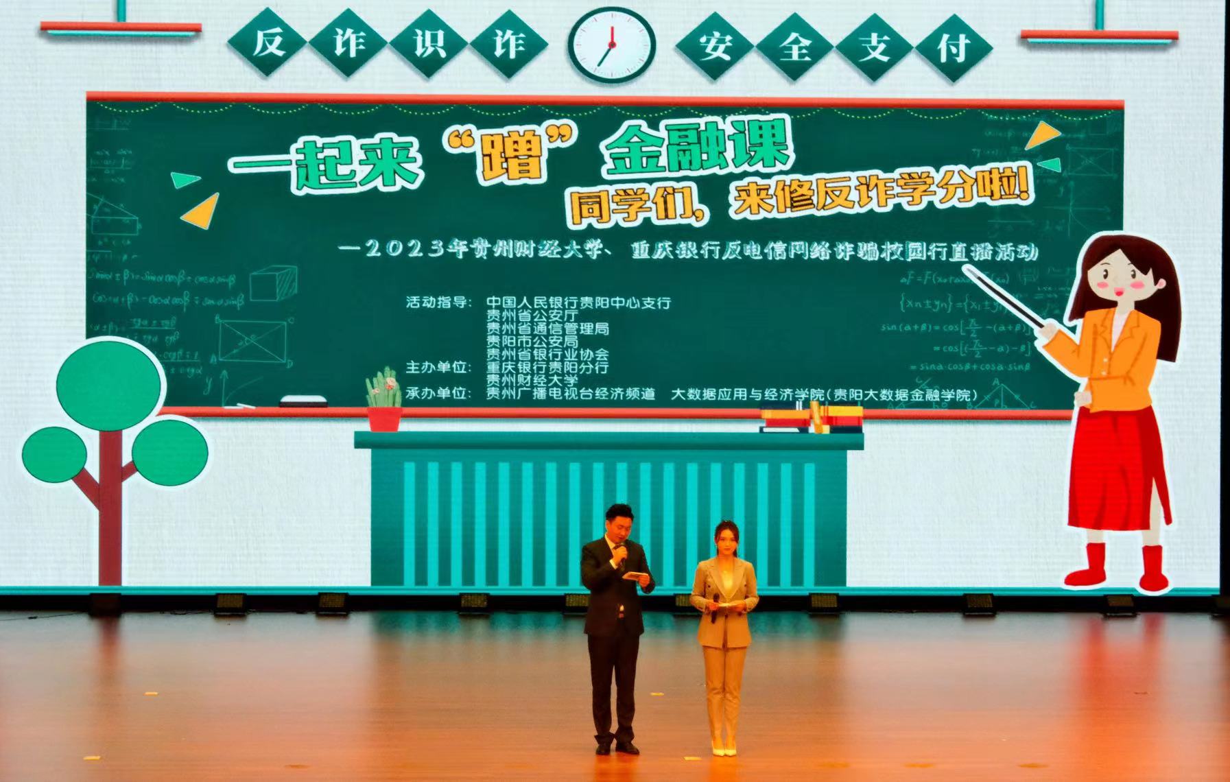 随着上课铃声的响起,节目采取以舞台剧《刷单返利》为序章,讲述一名老员工被诈骗的故事。用艺术的形式让广大观众感受金融诈骗的层层套路与危害。紧接着,贵州省星火反诈联盟、贵阳市反诈宣传员刘俊利向同学们讲述了电信网络诈骗的“前世今生”,一一为同学们讲解了电信网络诈骗设备的起源、发展及其特点,同时也向同学们做出安全提示。随后,重庆银行贵阳分行金融反诈宣传员陈羲、刘腾向同学们普及校园反诈知识和“两卡”知识,他们以问答的形式对反诈知识进行宣传,使同学们在思考的同时将反诈知识牢记于心。最后,公司周晶教授分别从心理学和经济学的角度对金融诈骗进行全面解读分析,在用五大心理效应解读受骗者被骗的心理因素的同时运用经济学理论对金融诈骗的本质进行深入解析,并结合心理学效应和经济学方法提炼出防范金融诈骗的有效措施。