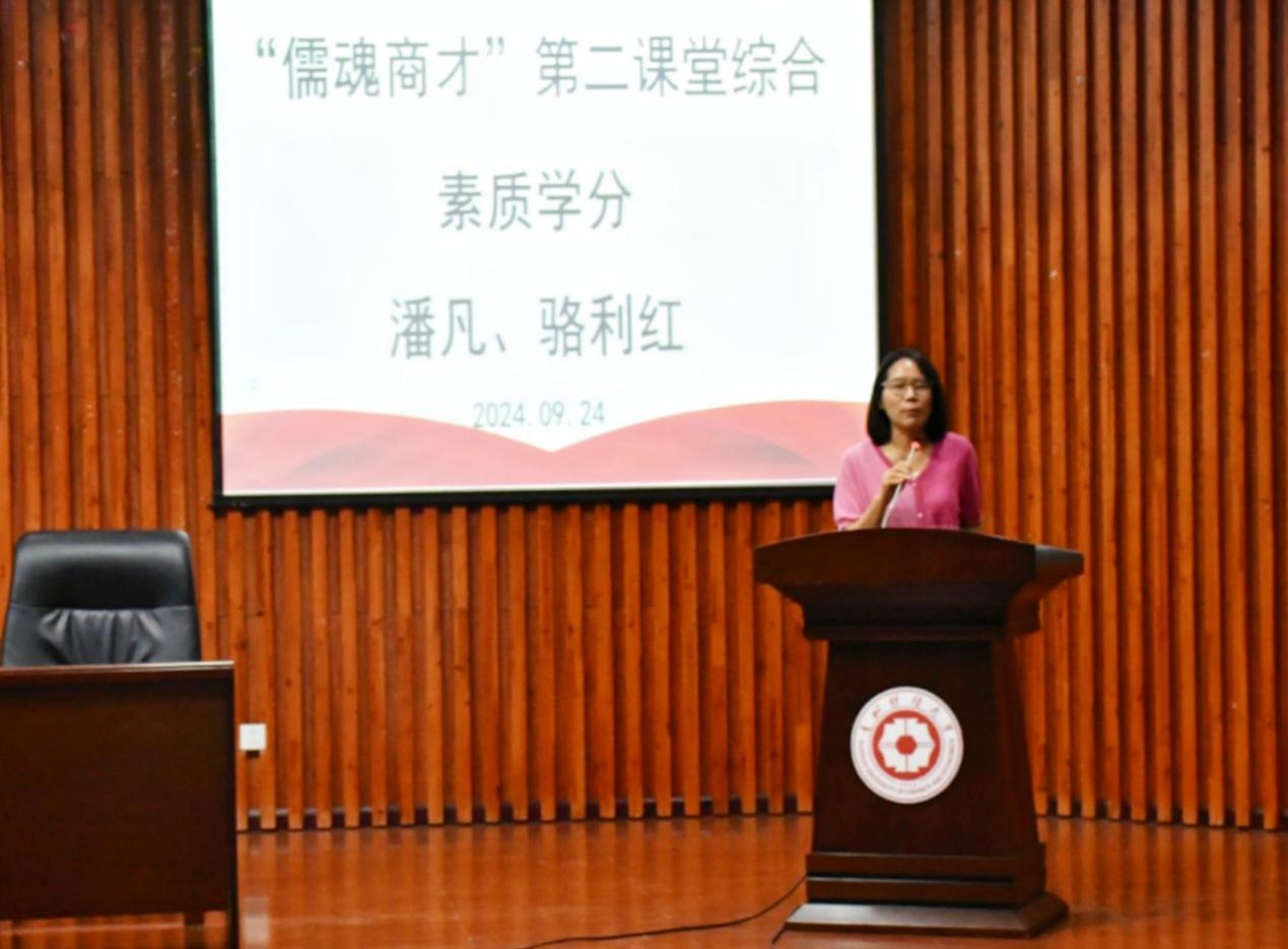 为了丰富校园生活,培养新生综合素质,9月24日,英国威廉希尔英文官网于图书馆报告厅组织开展“儒魂商才”第二课堂综合素质学分新生培训。此次培训由团委副书记潘凡老师和教务办骆利红老师进行讲解,2024级全体本科新生413名同学参与本次培训。