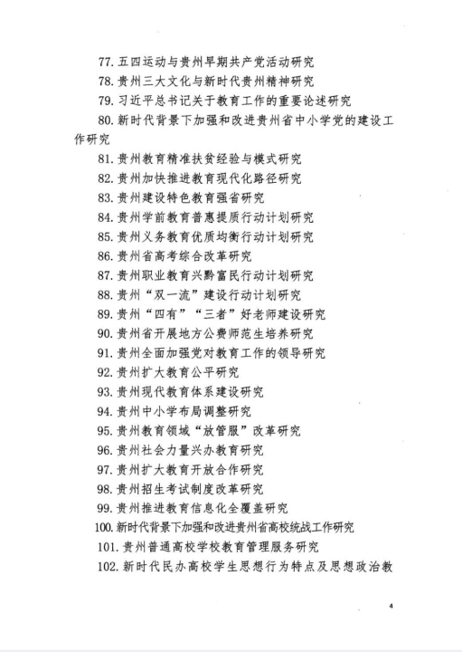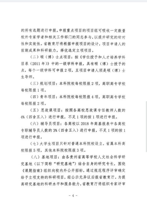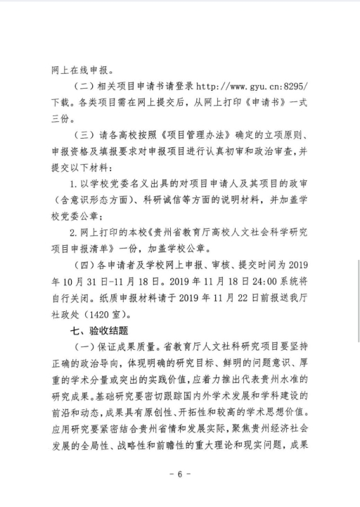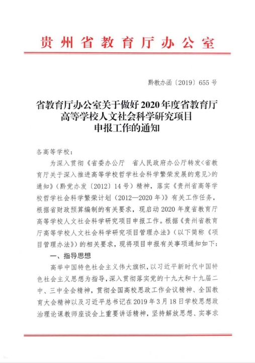 为深入贯彻《省委办公厅省人民政府办公厅转发《省教育厅关于深入推进高等公司哲学社会科学繁荣发展的意见>的通知》(黔党办发(2012)14号)精神,落实《贵州省高等公司哲学社会科学繁荣计划(2012-2020年)》有关工作任务,根据省财政预算编制的有关要求,根据教育厅下发的《关于启动2020年度省教育厅高等公司人文社会科学研究项目申报工作的通知》要求,以及《贵州省教育厅高等公司人文社会科学研究项目管理办法》(以下简称《项目管理办法》)的相关规定,现将项目申报有关事项通知如下: