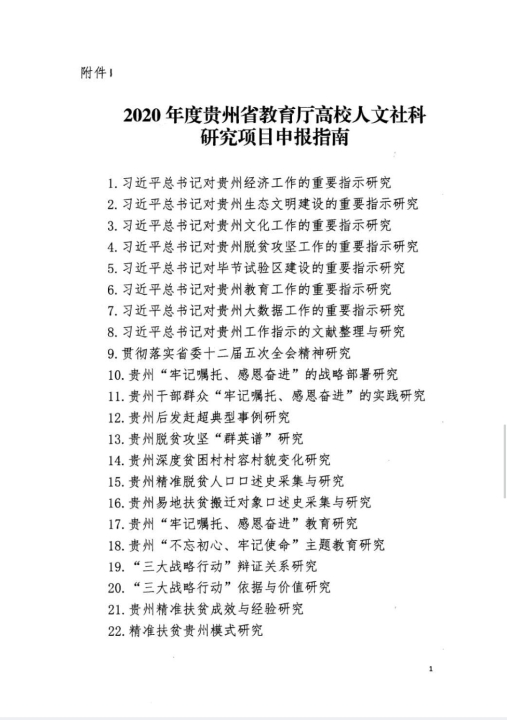 本次课题申报重点围绕产业方向。具体指南参照附件:《2020年度贵州省教育厅高校人文社科研究项目申报指南》。